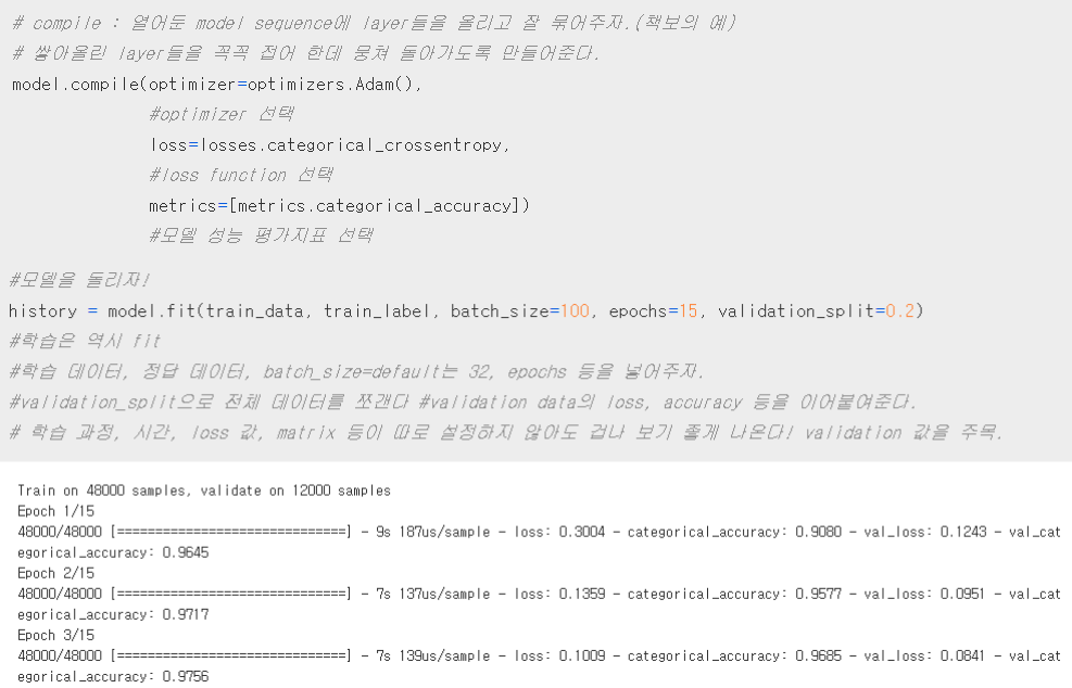 compile 단계 : optimizer최적화 프로그램, loss function, metrics평가 지표 등을 선택