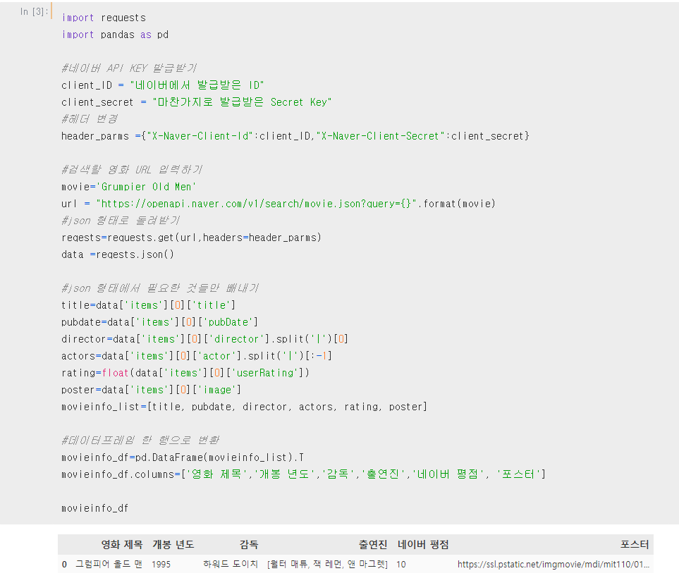 2-2. 영화 포스터 확보를 위한 크롤링 -> 네이버 API 활용 : 영화 포스터도 데이터베이스 과정에서 확보하려고 했다. 찾다보니 네이버 API에 영화 검색 기능이 있어 이를 활용하면 충분해보였다. 적용도 간단해서 좋다. 하루 25000건까지 무료로 쓸 수 있다. 나중에 사이트 구축에 있어서도 기본이 될 듯하다.