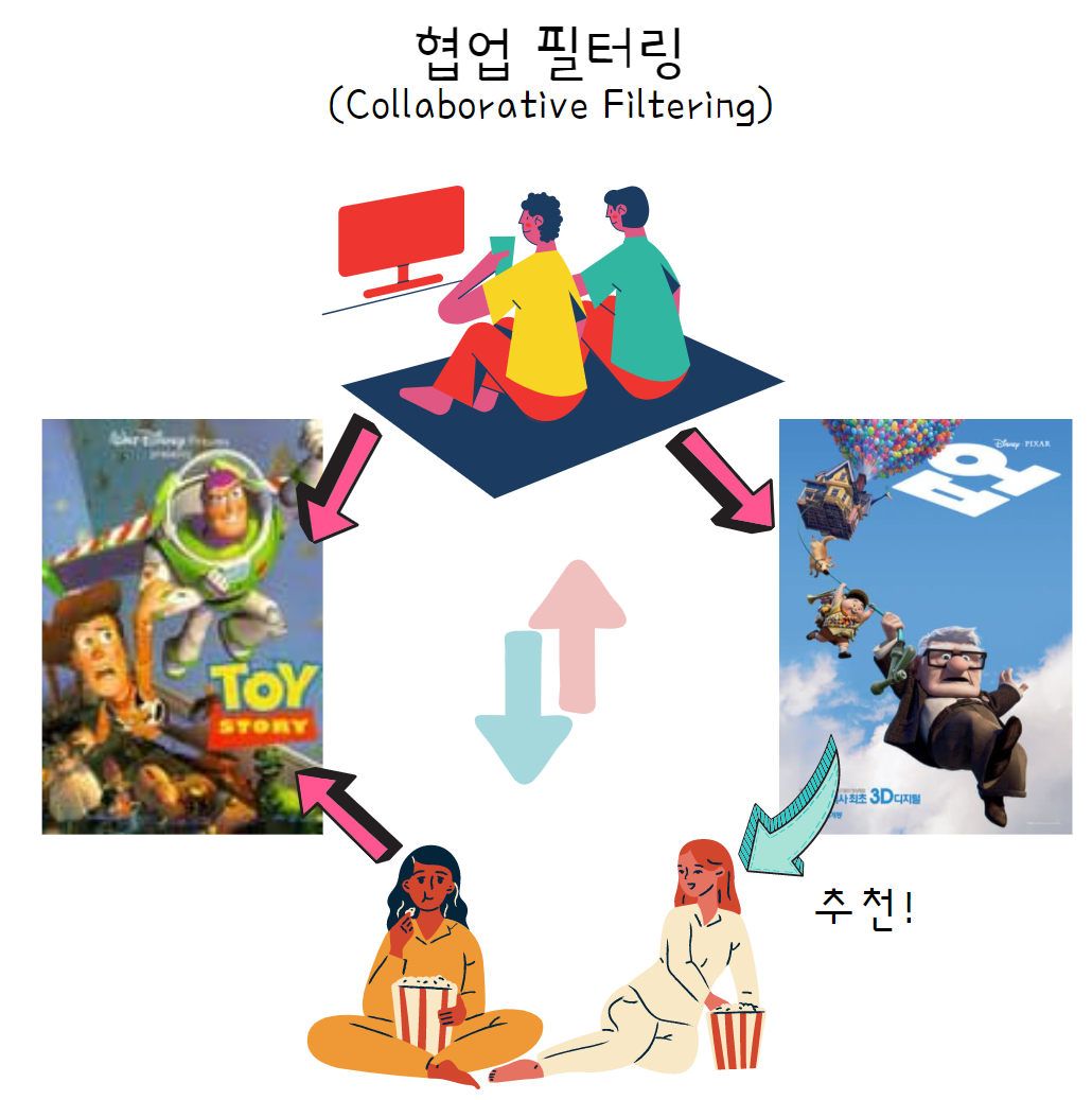 이를테면 여기 위의 그룹은 토이스토리를 보고 업을 추천 받았고 결국 둘 다 만족했다. 이제 다른 사용자 그룹이 왔고, 이 사람들은 토이스토리를 재밌게 봤다. 그럼 이들은 저 위 그룹처럼 업 역시 재밌게 볼 확률이 높다.